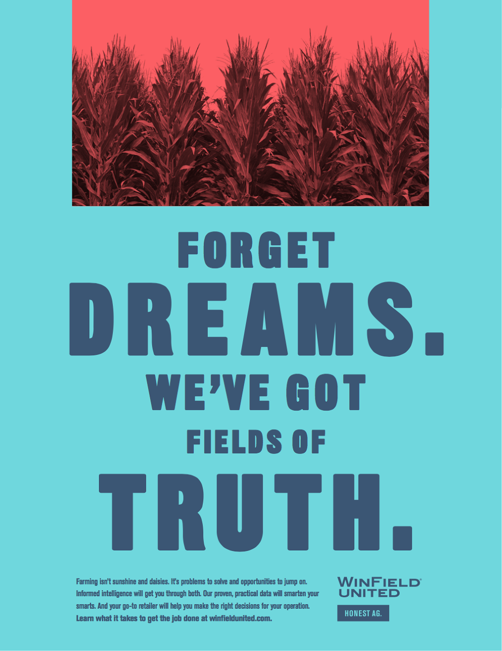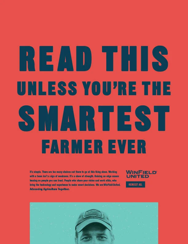 Agriculture marketing is overgrown with tired clichés and worn-out photography. We helped WinField United buck that trend. We stripped away the earthy colors, the sentimental imagery and the trite claims. Instead, we instigated honest conversations and introduced bold design. WinField United became the confident, norm-breaking, forward-thinking partner farmers have been waiting for. We called it Honest Ag.